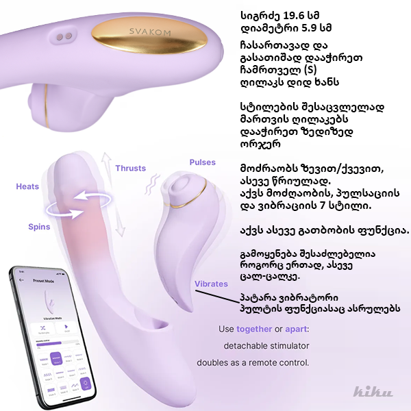 1. ერთი ვარიანტია რომ გამოიყენო როგორც რებიტ ვიბრატორი, კლიტორის პულსაციით და G წერტილის ვიბრაციით.